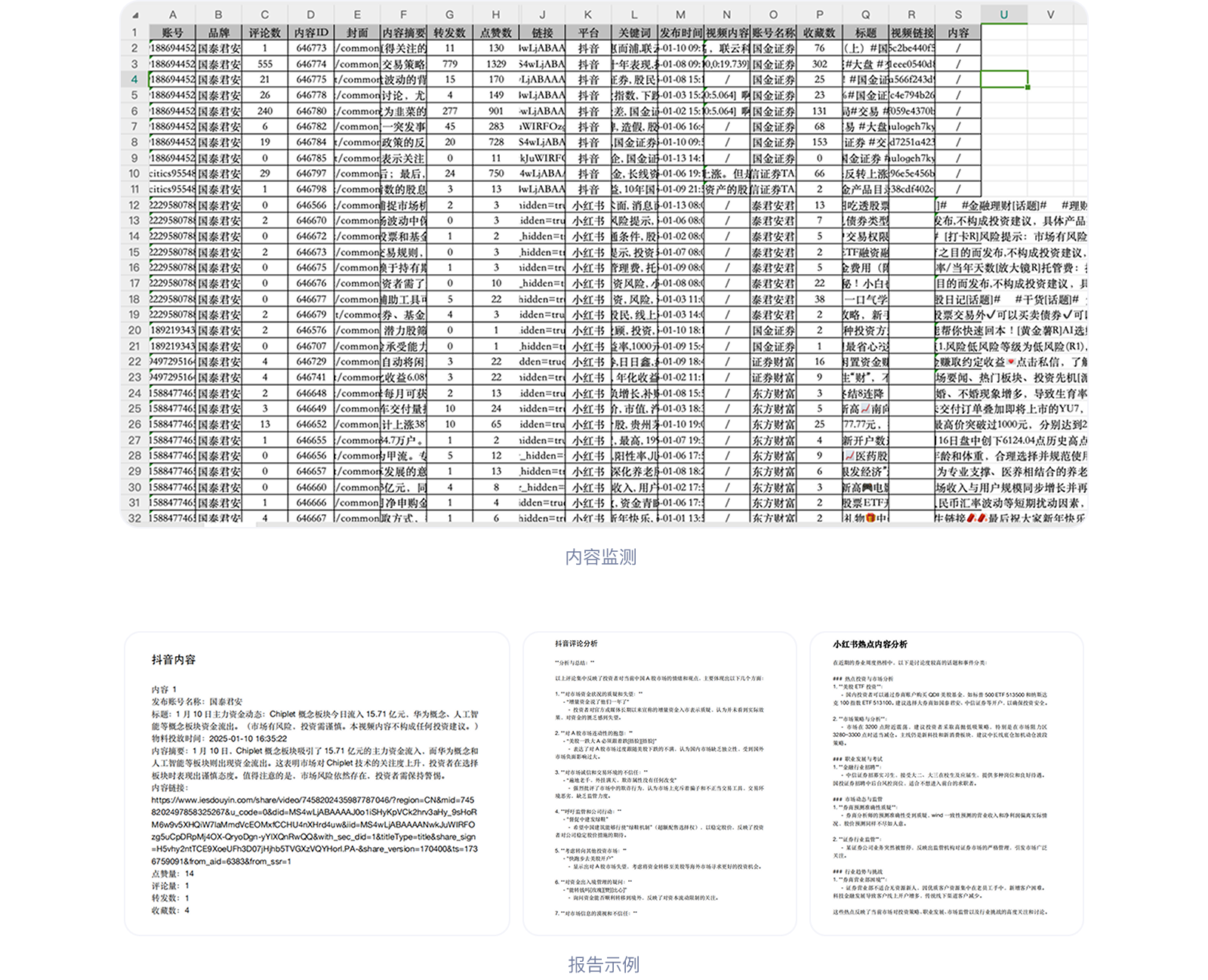 国金证券在布局新媒体矩阵时发现,现有运营体系难以支撑“热点捕捉-竞品对标-内容迭代”的敏捷闭环:人工整理20家头部券商的周度功能迭代报告需消耗3人日,小红书“低门槛理财”话题的1572条UGC内容中隐藏的用户认知偏差未被量化挖掘,抖音爆款投教视频的互动峰值与A股大盘波动关联规律尚未形成数据模型。